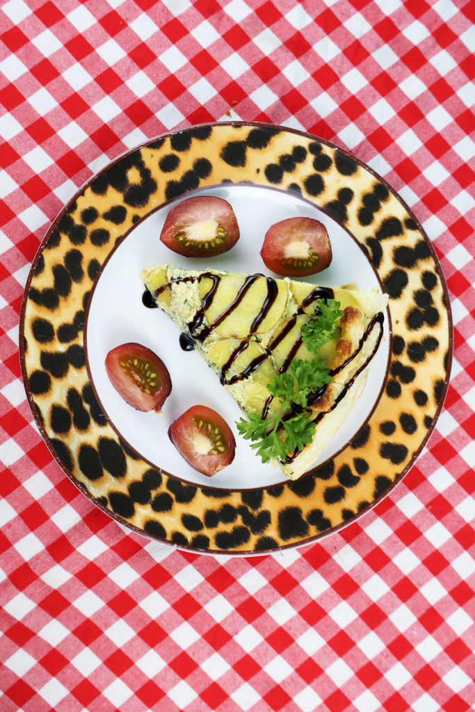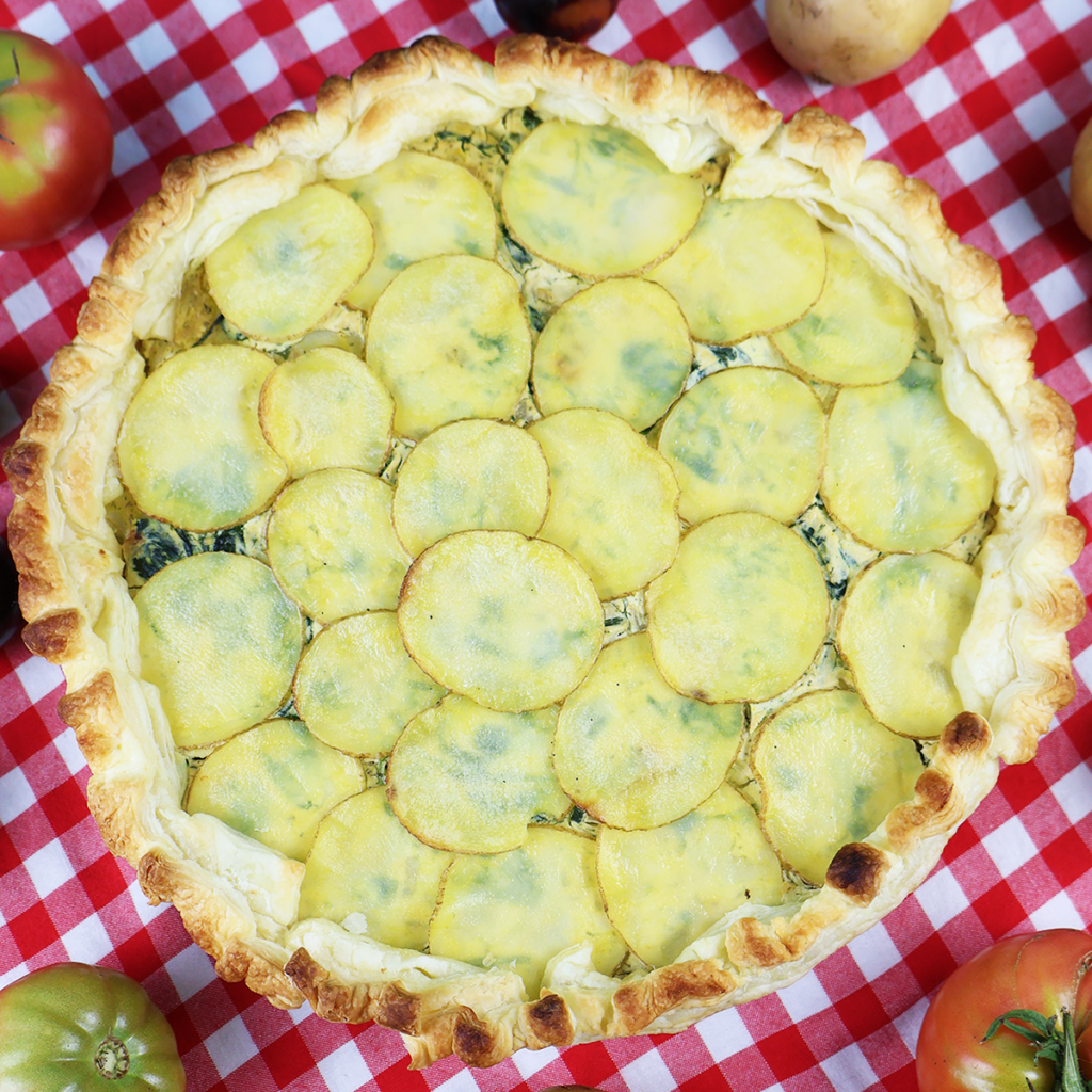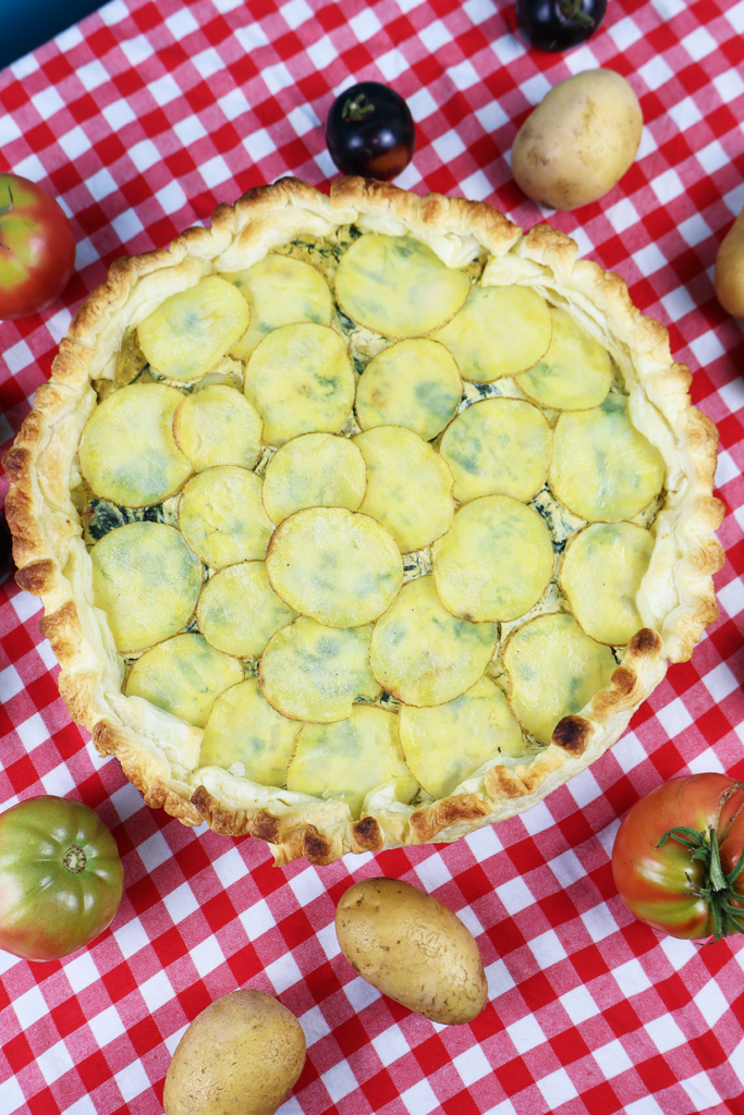 7. Posmaruj dno tarty małą ilością tofu ze szpinakiem, następnie ułóż jedną ścisłą warstwę ziemniaków, następnie połowę pozostałego tofu ze szpinakiem, kolejną warstwę ziemniaków i pozostały farsz. Na samą górę wyłóż startego i zblanszowanego ziemniaka. Zawiń rogi ciasta i posmaruj całą górę rozpuszczonym masłem. Ja zużyłam pozostałą część ciasta na (niezbyt) finezyjną falbankę.