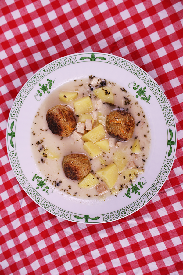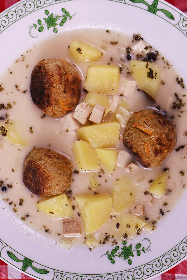 🍲 Dodaj ziele angielskie, liść laurowy, tofu wędzone i ziemniaki i zalej wszystko bulionem. Gotuj do zmięknięcia ziemniaków. 🍲 Zabiel roślinną śmietana, dopraw solą i pieprzem do smaku i podawaj z pulpecikami i listkami świeżej mięty.