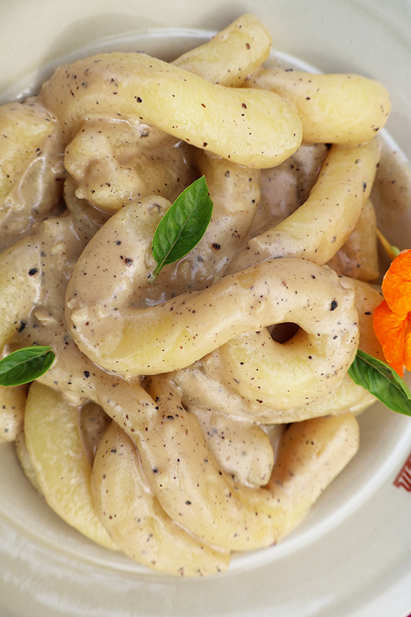 - Do sosu wrzuć ugotowane kluski i mieszaj, aż sos całkowicie je oblepi. Dopraw solą w razie potrzeby i podawaj od razu.