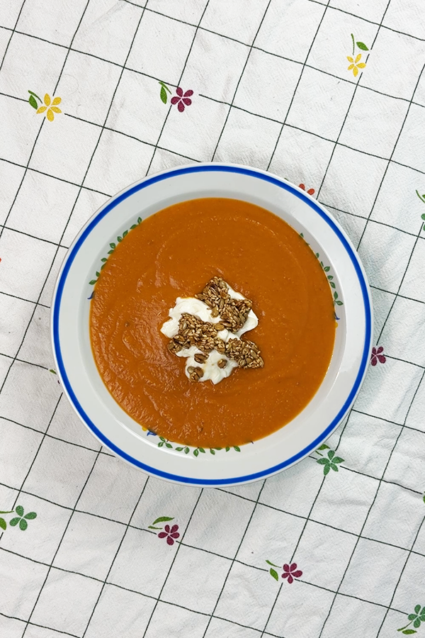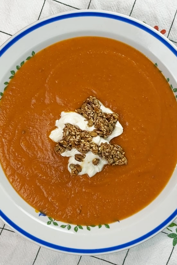 🍲 Zupę zblenduj na całkiem gładko, dodaj mleko kokosowe i dopraw do smaku solą. 🍲 Podawaj z łyżką kwaśnego jogurtu i mieszanką słodzidła z prażonymi pestkami i pikantną oliwą.
