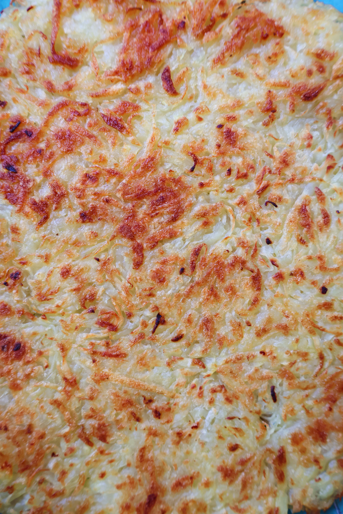 Rösti, czyli banalne ale zjawiskowe olbrzymie placki na całą patelnię. Idealne do wegańskiego gulaszu, jedzenia solo, czy też z roślinną śmietanką albo jako jako „biszkopty” w ziemniaczanym torcie… jak się okazuje.
