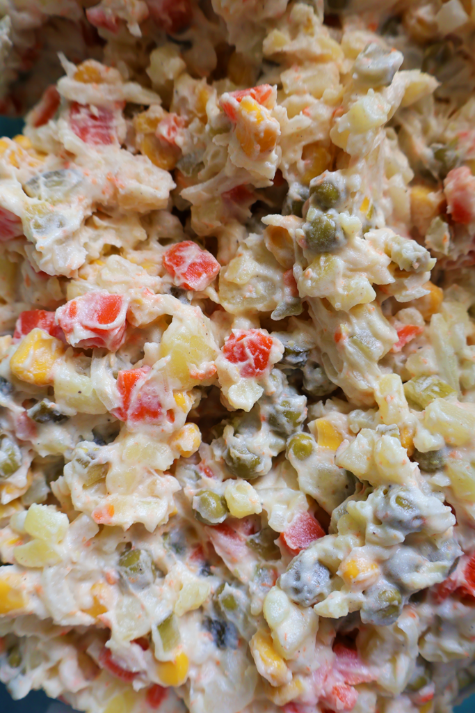 - Dodaj odcedzony miks warzyw (lub ugotowaną marchewkę pokrojoną w kostkę, groszek i kukurydzę) i ugotowane wcześniej pokrojone przestudzone ziemniaki.