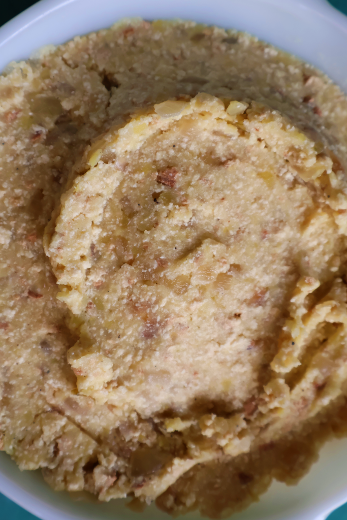 - W misce połącz ziemniaki, tofu, cebulkę, sól, pieprz, opcjonalnie zakwas i dokładnie wymieszaj.