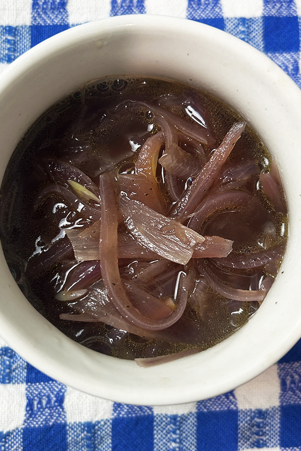 - 250g czerwonej cebuli pokrojonej w piórka (mniej więcej dwie duże)