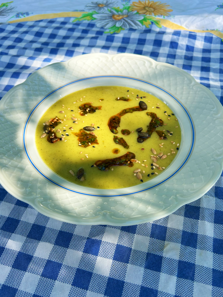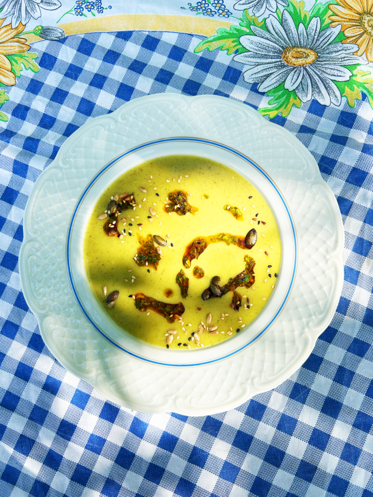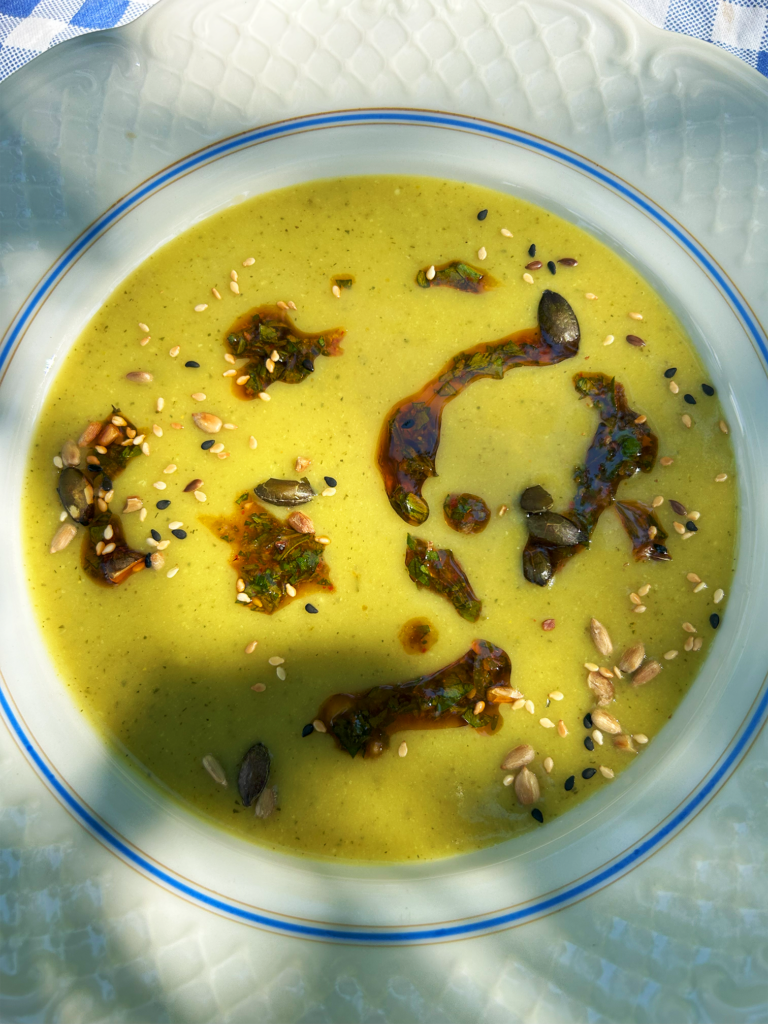 Kokosowo-limonkowy krem z cukinii z dodatkiem sosu inspirowanego chimichurri